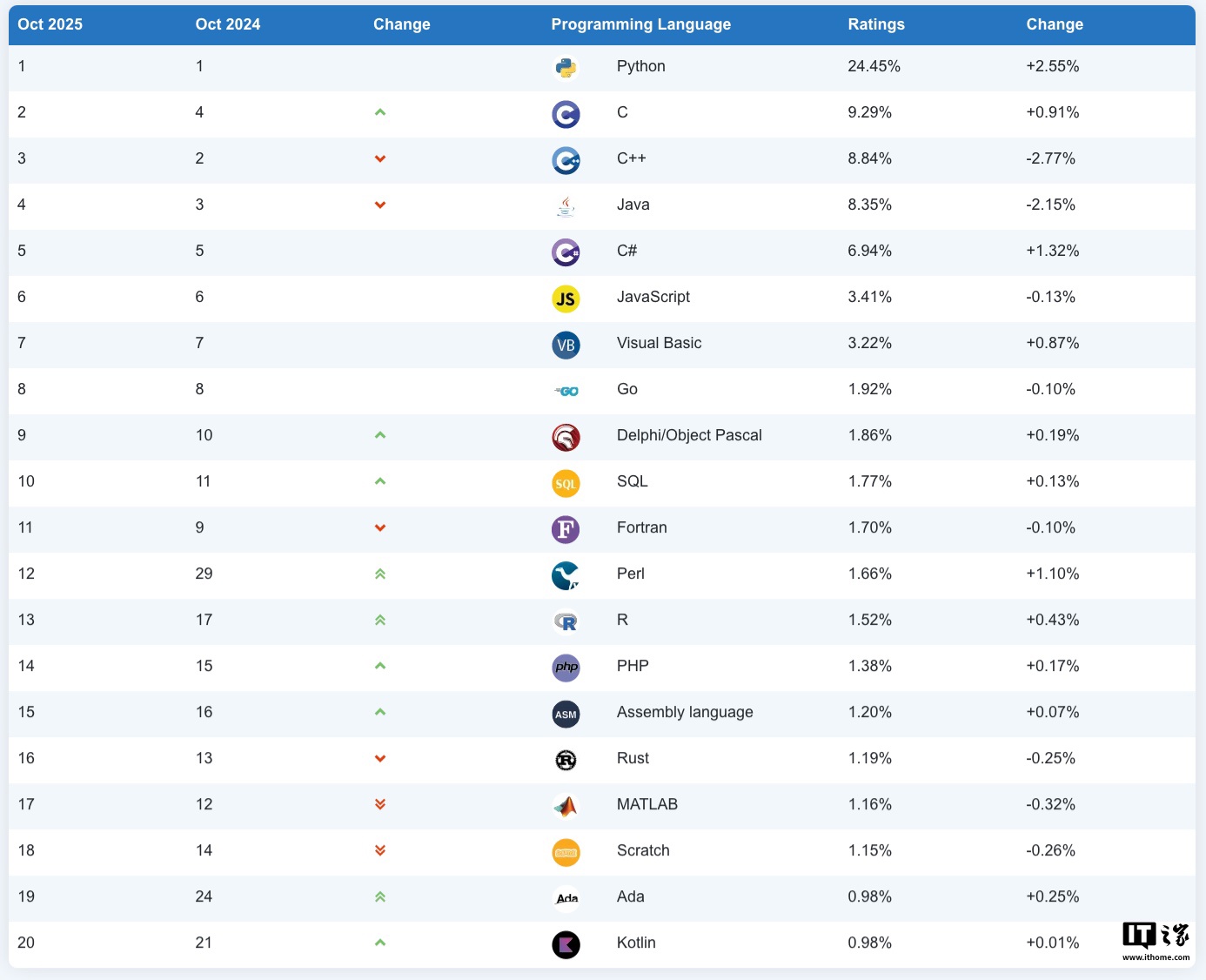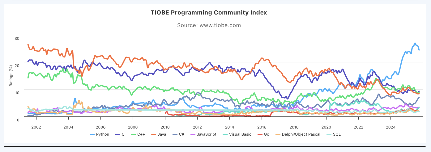 TIOBE 指数 2025 年 10 月排行榜公布:C、C++ 和 Java 互争榜二,Python 稳如泰山